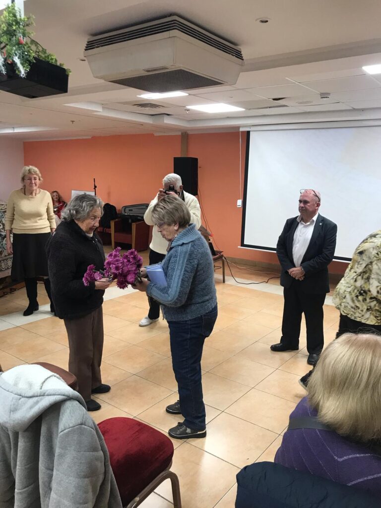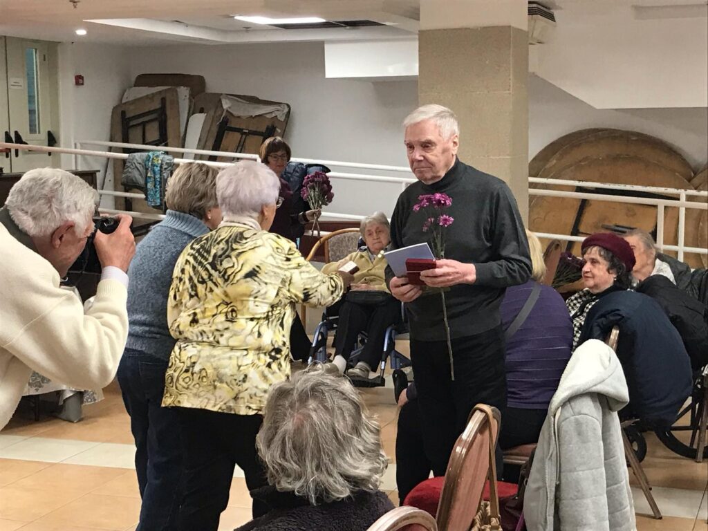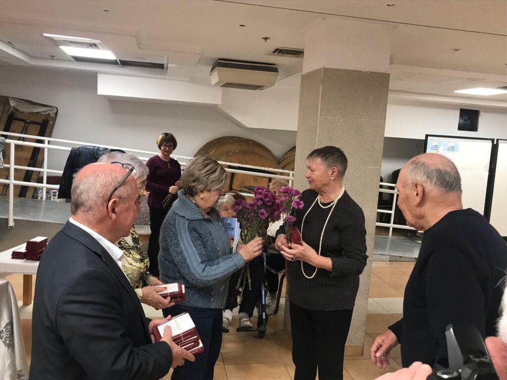 Под громкие аплодисменты Юда Давыдов, Эмилия Ларина и Тамара Дырда вручили блокадникам юбилейные медали, цветы, а также подарок — книгу об Иерусалиме.